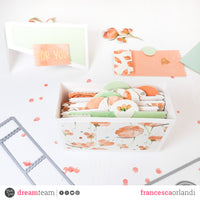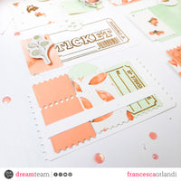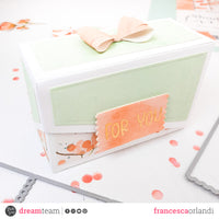 Ho scelto di usare la collezione “Shades of Love”, per realizzare la scatola ho usato la fustella “Ticket Box”, e la fustella “Creative Ticket” usando sia quello grande che i piccoli: su alcuni ho embossato i timbri “Ticket” su altri ho lasciato lo spazio per la foto.