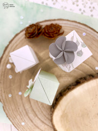 Per la decorazione mi sono lasciata prendere dall’entusiasmo e ho utilizzato un pò di questo e un pò di quello delle varie stupende novità di quest’anno. Il fiorellino *Frangipane Flower* è qualcosa di spettacolare nella sua semplicità: un piccolo origamo in tutto il suo splendore. Vogliamo parlare delle *Deco Lines*? Io l’ho utilizzata per abbellire il lato della scatola “cucendo” il twine grigio.