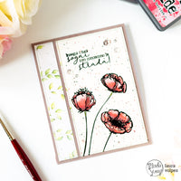 Ho iniziato fustellando del cartoncino da acquerello con una delle fustelle nel set *Dashing Rectangles*. Ho poi timbrato i fiori del set Papaveri con un tampone nero e li ho embossati con polvere trasparente. Per creare un look omogeneo con le carte della collection Let Your Soul Bloom, ho dipinto i fiori con la tecnica dell'acquerello e i Distress Oxide. Ho anche aggiunto delle goccioline per creare interesse sul pannello.