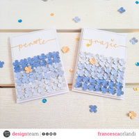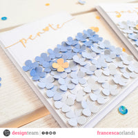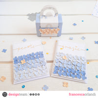 Per il bigliettino di ringraziamento, in cui andrà la foto, ho usato sempre la fustella “Millefiori” e i fogli della Color Palette “Hello Sweet Boy”, ma stavolta ho scelto i 3 azzurri in gradazione. Per le scritte ho scelto le fustelle “Per Te Script” e “Grazie Script”, per la base ho usato la fustella “Dashing Rectangles” misura 7,6 x 10,8 cm.