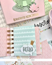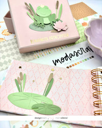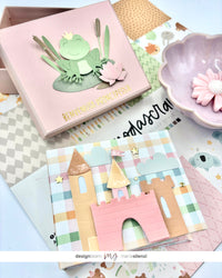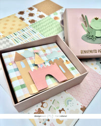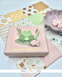 Come sapete mi piace tanto riciclare vecchie scatole, decorarle e riutilizzarle per conservare i miei mini album. Stavolta ne avevo una davvero perfetta, rosa e di media grandezza, così ho deciso di coprire la scritta che aveva sul coperchio con una carta monocromatica e abbellirla con la dolcissima ranocchietta della fustella FROG e un rub on, dal quale potete intuire che sarà un regalo per una bellissima bambina, venuta al mondo da poche settimane.