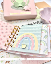 All’interno ho inserito un mini album, la cui copertina è stata rivestita con la covering paper a righe della collezione “A new baby is born” e decorata con le fustelle CASTLE e MOON CARD.