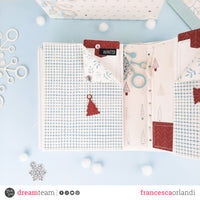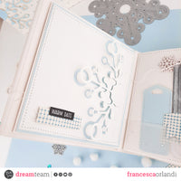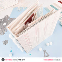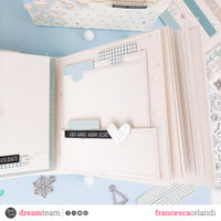 Ad ogni pagina potete aggiungere delle tasche in cui inserire, le tag i quadrati “Dashing Squares” abbelliti con la fustella “Tab Set”.