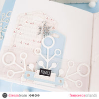 - Ho tagliato a metà un fiocco di neve e l’ho incollato sul bordo laterale della pagina così da infilarci sotto altri cartoncini porta foto