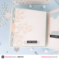 -Su un cartoncino bianco (11,5x11,5) ho fustellato solo metà fiocco di neve senza tagliarlo via completamente, e ho incollato sul retro la carta Double face Pastel Blue in modo che quando il fiocco si solleva, si intraveda l’azzurro.