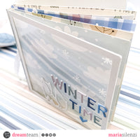 Ho creato una cornice con la carta bianca e usato la fustella a volpina e l’alfabeto puffy per creare il titolo. A fare da sfondo al paesaggio invernale, c’è la prima pagina della struttura interna, realizzata con la nuova collezione “Winter time”.
