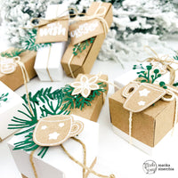 Con la fustella *treat holder* ho fustellato la carta kraft e la woodstock bianca creando una coppia di scatole che ho decorato con i sentiments «make a wish» e «warm hugs just for you» del set di timbri forever green. Con la fustella *the cube* ho fustellato la carta kraft e la woodstock bianca creando un’altra coppia di scatole che ho decorato con le tazze del timbro *cheers*.
