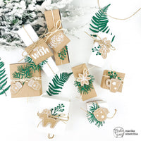 Ho timbrato tutte le decorazioni sul kraft e le ho embossate con la polvere bianca. Infine, con le fustelle *winter greenery* e *fern* ho creato le decorazioni dei rami e delle foglie.