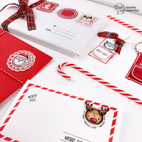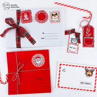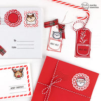 Con il set di timbri e fustelle *postage bits* ho timbrato e fustellato la woodstock bianca e un cartoncino rosso, creando dei francobolli con cui ho decorato il libro e le buste da lettera. Ho timbrato e colorato i quattro personaggi del set di timbri *postage xmas* e li ho utilizzati per decorare i francobolli e le tags.