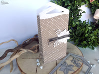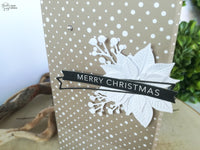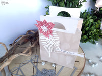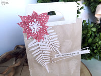 Le maniglie del packaging medio, invece, le ho realizzate utilizzando un rettangolo della fustella “Suitcase Add On” facendo un buco con la parte superiore a semicerchio della fustella “Mailbox” mettendo la fustella appena fuori dai piatti della Big Shot in modo da non tagliare tutta la parte. In questo caso ho abbellito un angolino della maniglia con la stella di natale usando ancora la fustella “Winter Greenery” e due rametti di fellce usando la fustella “Fern”. Inifine ho incollato un sentiment sul banner.