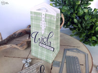L’ultimo packaging più piccolo l’ho fustellato al , prima di chiuderlo, con la fustella “Deco Lines” con le stelline e, come per la prima paper bag, ho fustellato dalla “Ribbon Tag”, questa volta la misura più piccola, e tagliata in due per creare nuovamente le maniglie. Però questa volta invece di incollarle direttamente al l’interno del sacchetto, ho tagliato una strisciolina di plastica da un sacchetto e ho incollato una estremità sulla maniglia e l’altra sul sacchetto, facendo in modo che le maniglie si potessero allungare, per far così svelare un sentimet. Queste due maniglie quando sono chiuse sono legate dalla “cintura” e la fibbia delle fustella “Suitcase Add On”. Con il timbro “Wishes” ho timbrato la parola Wish è l’ho ritagliata a mano ed incollata al sacchetto (facendo sempre attenzione alle pieghe del sacchetto) con sopra un sentiment.