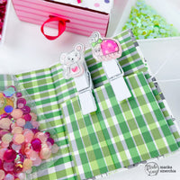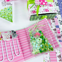 2. Clips decorated with the characters from the *Color of puppies girl* stamp set and a tag that I sealed with the fuse tool containing the *sparkly sequins leafy green*.