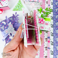 3. Wooden clips decorated with animal figures and a tag containing the *sparkly sequins spring rose*.
