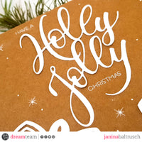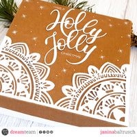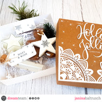Today I have designed a larger box. I love the combination of kraft paper and white. I decorated the big box with the *Oriental card* die and the *Holly Jolly* die. The stamp set *Mistletoe branch* is a perfect match, as it contains the lettering I used. And of course, stars must not be missing. These are in the great stamp set *Fiocco di neve*. They fit perfectly.
