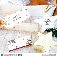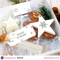 I used this stamp set to create the little gifts inside the box. You can also stamp wonderfully on wood, like with my wooden star. In the test tube I stamped on transparent paper so that you don't see the inside right away. The little matchbox for the candle also got some snowflakes. And finally a little pendant for the magical gingerbread man with the *Hanging tags* die set.