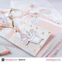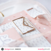 I put our wonderful "Hanging Tag Dies" in the envelopes and used a nice ribbon and the words "Love is in the air" to decorate the cuts. My absolute favorite is the vellum with hearts of gold. Is not she Lovely?