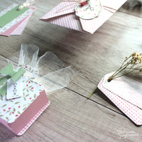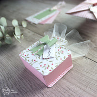 The sugared almonds box is made with the *Shopper* die set, a small green bow and a little tag that are all part of the die set. For the placeholder I went for a clean and simple look, cutting two of the smallest tag of the *Hanging tags* set with some *Vellum* and, again, the *Wild flowers 02*.