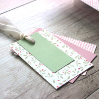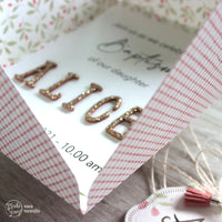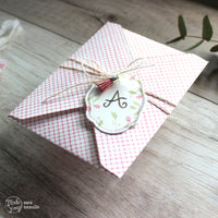 For the invitation I've printed the message on a piece of *Woodstock white*, leaving some space to add the name's letters die cut with the *Funny Alphabet* die set. To tie everything up I've used a piece of burlap string with a *Sweet label* and a mini tassel in *Deep rose* to finish it up!