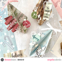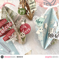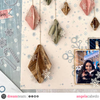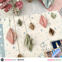Both the layout and the Christmas balls are worked in the same way. I have used several sizes of the Diamond Tags die and the pieces that do not come out of that die, I have folded them in half, up to a total of 6 pieces of each size (in the case of the Christmas balls, and 3 pieces in the case of the Layout), and I have glued them together until they form the star that I wanted. More pieces could have been added to make the star fuller but my idea was that the decoration that I put on top would be perfectly visible.