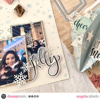 In the case of the Layout, I have used the small Diamond tags dies to make 4 stars, the next die to make 3 stars and the next one only to make 1, which is the one that is located the lowest of all. I have glued a string from the top of the paper to the star, and thus make it look like they are balls hanging from the wall. In the area of the photo, on the back there is a large snowflake, which is perfect as it comes out of one side of the photo. Also in worn out the stamp with the word Jolly that is beautifully placed is the corner of the photo. To finish, I have decorated all the balls with snowflake dies from the Christmas charms die pack.