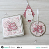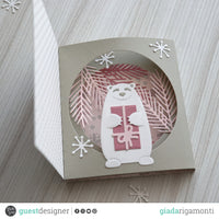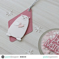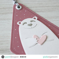 Con il cerchio avanzato dalla Tunnel card ho creato un chiudipacco abbinato, alternando due cerchi di dimensioni diverse e decorandolo con una delle altre fustelle del set Christmas Branches. Non potendo resistere a quel musino, con il cartoncino avanzato ho fustellato un altro orsetto con il cuore in mano e l’ho incollato su una tag ottenuta con uno dei Diamond Tags.