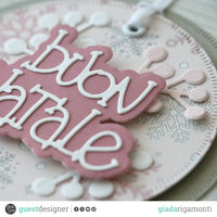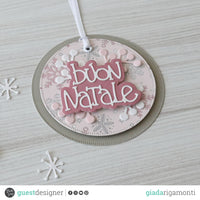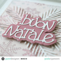 Per decorare il pannello frontale ho utilizzato le fustelle Dashing Squares in diverse misure, così da ottenere una sorta di “cornice” che richiamasse gli elementi presenti all’interno del biglietto. Per l’augurio al centro ho scelto la fustella Buon Natale, facendo risaltare il bianco della scritta sul cartoncino malva.