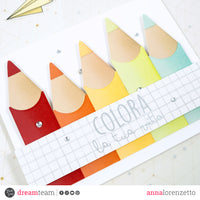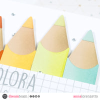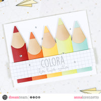 Per iniziare, ho fustellato le cinque matite colorate utilizzando i cartoncini Double Face nelle tonalità Pastel Strawberry, Pastel Mandarin, Pastel Yellow, Pastel Green, Pastel Tiffany e Pastel Sand (per le punte). Ho quindi tagliato una faccia dalle forme appena fustellate (ideate per assemblare una scatola), ricavandone così una figura bidimensionale.