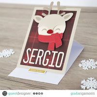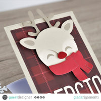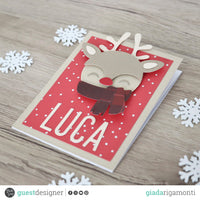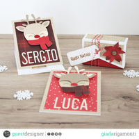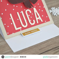 For the front panel of my placeholders I used a couple of papers from the newest pack The Magic of Christmas and the Giant Alphabet die set, as well as the reindeer that can be built with the Santa’s Friends die set. To make one of reindeers look similar to Rudolph, I decorated its nose with a bit of red foil. To complete the placeholder I glued a couple of golden sentiment strips from the set Auguri di Natale Gold & Silver with a bit of foam tape, in order to keep the panel upright.