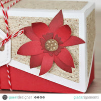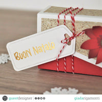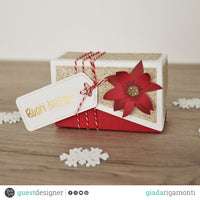 The customized placeholders can be given to our guests or used as a simple card for a present. In any case I created a little box that can match the card-placeholder: I made it with the Ticket Box die set and decorated it with a paper from the set Sudtirol Origins, as well as a poinsettia built with the Flower Mix dies. Finally I die cut a little tag from the Hanging Tag die set, on which I added a sentiment with a glue rub-on - Auguri and a golden foil.