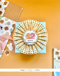 With the “congratulations” and “frame circle” dies, I created a rosette, on which I superimposed a die cut with 12 months written, because the purpose of the project is to enclose some of the most beautiful photos of the first year of life.