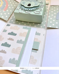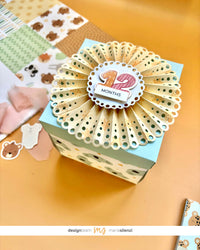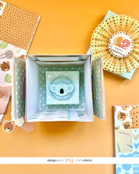 Inside, in the central square, I glued a box created with the “cookie box” die, in which I enclosed a mini accordion album. I covered the outside of the box with some letters from the “alphabet stickers white”, a circle from the “framed circles” and the cute little face from the “koala” die.