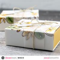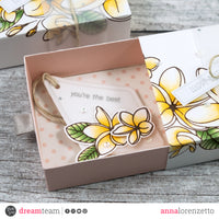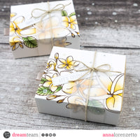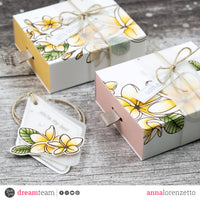 To begin, I stamped the floral image from the Frangipane set on two white card stock panels and colored them with Copic Markers. Then, I created two boxes using the Pastel Pink and Pastel Yellow Double Face card stock and covered them with the two previously stamped panels. I also added two Vellum strips and natural twine bows as embellishment.