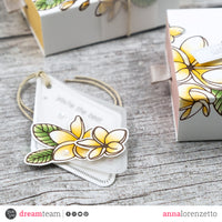 Next, I created the tag. I used the Diamond Tags set and die-cut the same tag twice, once out of white card stock and the other out of Vellum Hexagons Holographics. I stamped the sentiment on the white card stock tag and layered the vellum one over it, creating a blurry effect. Then, I stamped and fussy cut a couple of flowers from the Frangipane set and used them to finish its look off to perfection.
