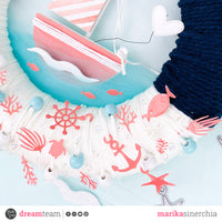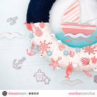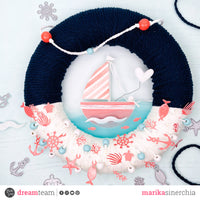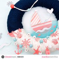 Once dried, I took some white and tiffany wooden beads and all the elements with the hole (the fish, the rudder, the starfish and the anchor) and inserted them into the white cotton thread. Then I covered the lower part of my wreath.