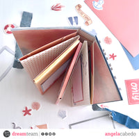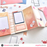 For the interior I have cut the basic Coral and Blush double-sided papers at 19.2x30.2 marking with the folder and folding at 8.9 - 0.3 - 8.9 - 0.3 to form those two structures that are glued on both sides of the interior. I have also wanted to add an envelope to each top of each structure, and I have cut two pieces of paper from the Sunset In the Beach collection to 23.1x23.1 and with the help of the punch board, I have created the two envelopes that have the same proportion as the first sheets of the structures, and I have glued them on top. These types of structures can be expanded as you create the album.