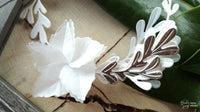 To finish I glued the “crepla” to thicken and embellished with a bow. I simply decorated the other with the bigger Poinsettia flower in vellum and lightly brushed with *Gelly*. On the right side I cut the twig of the wreath several times in white, vellum and silver.