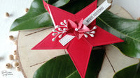 I die cut a prism out of *White Woodstock paper* and glued it into a small box. Then I punched 5 diamond embellishments with stitch markings from the paper collection the *Good Cheer for Christmas* and then I glued the other four diamonds by matching the short sides to create the star.