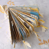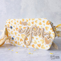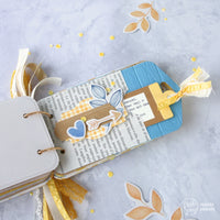 Afterwards, I cut out two holes for the book rings and put in some eyelets in matching colors to reinforce the holes. Than the fun began: I cut out different tags from the Save the bees paper, vellum, old books and from a kraft paper bag I had in my paper stash. To create pockets for hidden tags, I cut a tag in half, punched-out a semi circle and glued it carefully (don't use too much glue) on another tag. The smaller tag dies of this set will fit in.