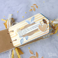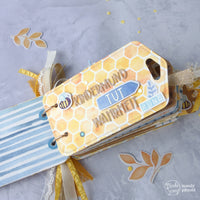For this album I used the Hanging tag dies, marked the outlines of the biggest tag shape twice on a piece of cardboard and cut them out. For covering the cardboard I used the Save the bees design paper in 12x12 inch. Just mark the outlines of the dies again twice, add apx. 2cm overlap all around the tag and cut them out.