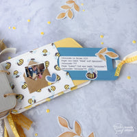 I decorated the album with the Save the bees die cut shapes, some ribbon of my stash, a stamp (Hugs & Kisses - Postage Hugs). I hope you enjoy my inspiration and you'll try to make a mini album own your own, it's so worth it.