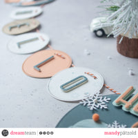 Ho scelto la collezione *Good cheers for Christmas* e abbinato qualche foglio bifacciale tinta unita, ho tagliato diversi cerchi di misure varie e le lettere dalla fustella *Giant Alphabet*.