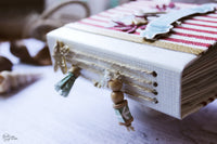 The binding part is so simple and easy, too. All you have to do is punch some holes both on the binding piece and on the scoring lines of the pages at the same point. Bind then the pages to the structure with pieces of rope. In order to hide the knots on the spine, add some embellishment such as Polyshrink and wood decors, die cuts and a little tassel.