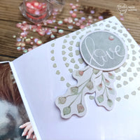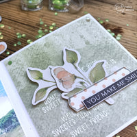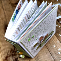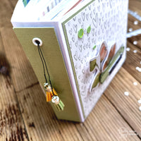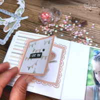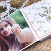 Almost every page has a composition with die cuts and a sentiment. To embellish some parts of the album I used the "Sparkly Sequins Leafy Green and Spring Rose". I also created a flap using the "Framed Rettangles" die that I love it because of the irregularities of the frame. I also made a triangle pocket by die cutting the “decorated lace” of the “Shopper” die and then inserting a photograph. I also created a window using the "Scallop Squares" die: cut on the three sides inside, leaving the frame.