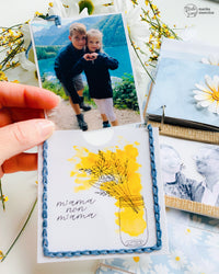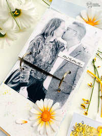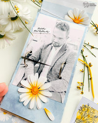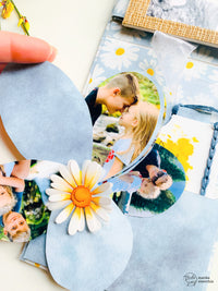 Inside I put the mini ring album with the photos of Matteo and Chiara that we did during the Frankfurt fair, a tag holder with children’s photo and I cut some photos in the shape of petal that by opening them, they take the shape of a daisy.