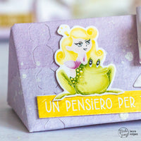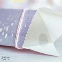 To start, I die-cut one of the designs in the Land of Fairies 12x12” paper pad with the Bon Bon die. I created four little boxes. Before closing them, I created droplets with the Fluffy in Brilliant White, that I thinned down with a little water. The droplets will add interest and sparkle to the boxes, thanks to the glitter in the Fluffy.