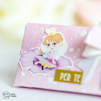 As an added detail, I fussy cut a few fairies from the Land of Fairies paper pad and added them to the little boxes. I then added sentiments with ModaScrap Gold Sentiment Strips.