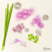 First of all, I took my green paper and cut some little stripes (0.5cm wide). Using my *Dream Flower* die, I then die-cut 10 sunbursts for each of the 3 available sizes (meaning 10 large, 10 medium and 10 small ones), plus a number of leaves.