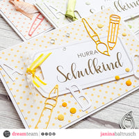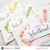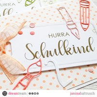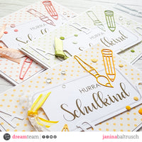 The cards are in the standard A6 format and measure 14.8 x 10.5 cm.I printed out the saying "Hurray school child" and punched it out with the MODASCRAP DIE - HANGING TAG.