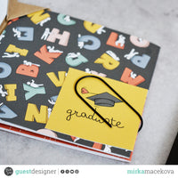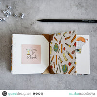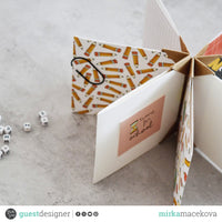 The mini album measures 15 x 15 cm. Its base is made of a folded comb made of craft paper. It consists of seven double-sided sheets of ModaScrap PAPER PACK SCHOOL DETAILS.