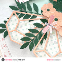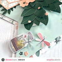 Since the collection of papers has the theme of garden, flowers and butterflies, I wanted to represent a butterfly playing with the basic papers and dies. I have used some of the dies from the Terrarium Box set to make the butterfly wings, and with the Spring Greenery die I have filled them with sheets with the basic Pastel Pine double-sided paper. Playing with the die cuts I have decorated around the butterfly.